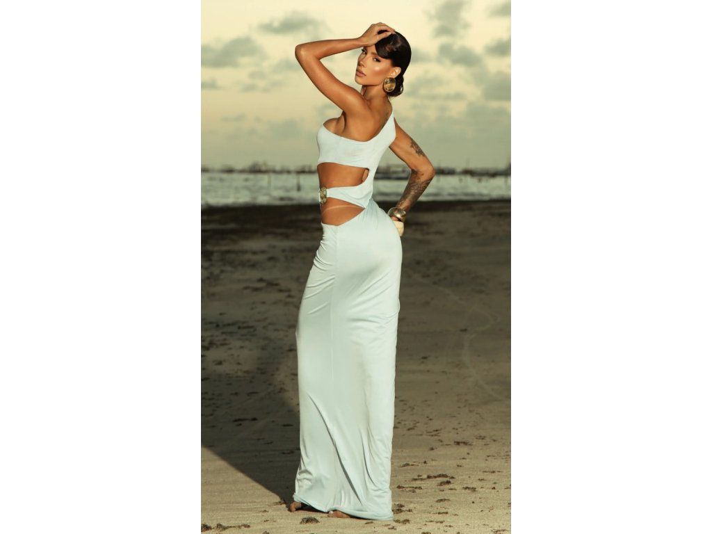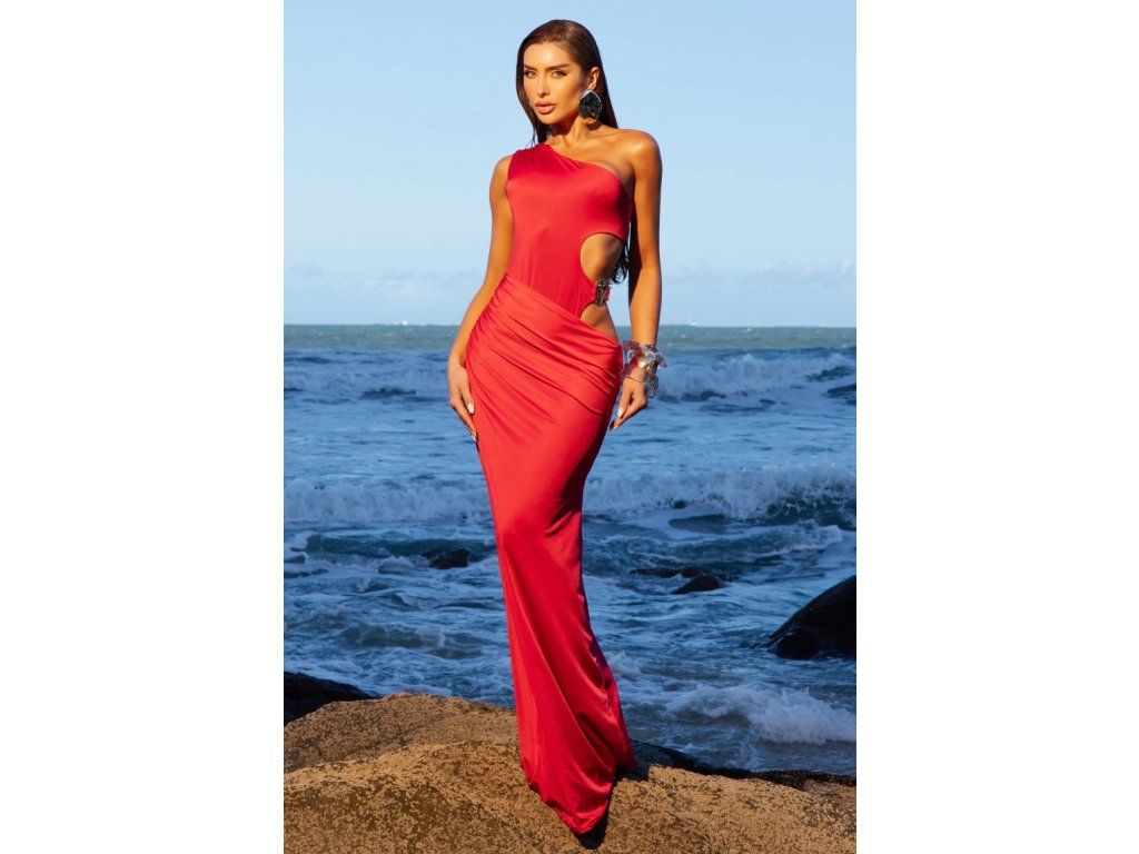 Model kombinuje efekt body a dlouhé splývavé sukně, čímž vytváří elegantní siluetu, která krásně kopíruje postavu. Strategicky umístěné průstřihy na bocích působí odvážně, ale stále velmi vkusně.